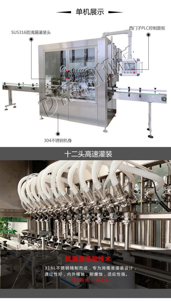 2、醫(yī)用酒精消毒液灌裝機(jī)適用于醫(yī)藥、日化、食品、農(nóng)藥、飲料及特殊行業(yè),是理想的液體充填設(shè)備
