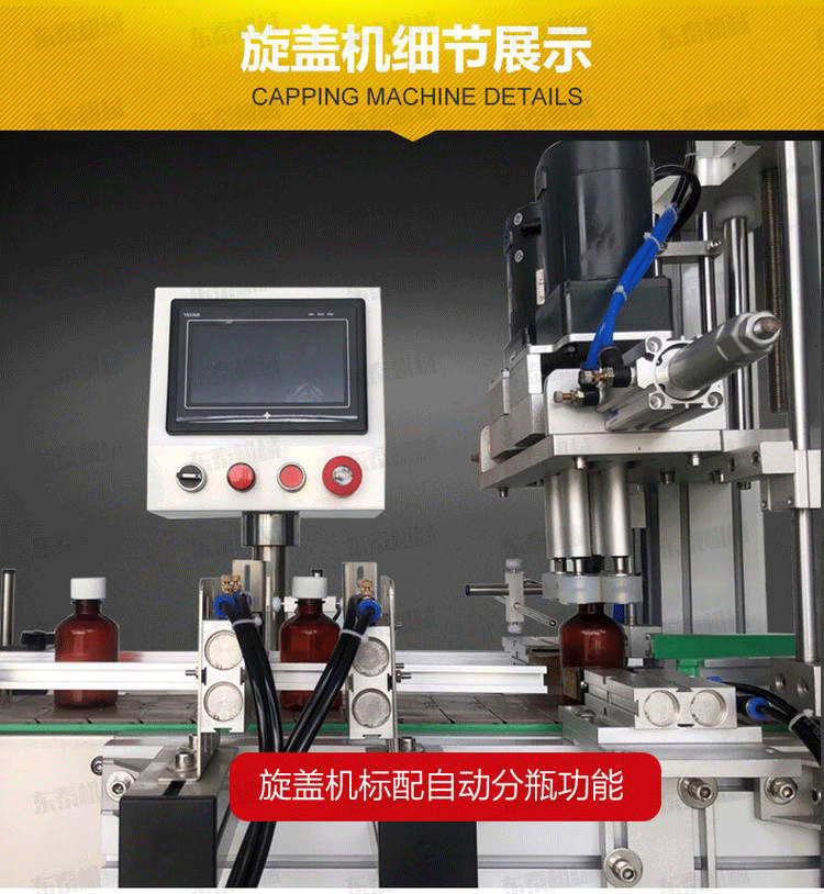 4、旋蓋機(jī)可適用于多種瓶型,旋蓋輪達(dá)到旋蓋時(shí)間旋緊蓋子后,自動(dòng)停止,保護(hù)蓋子和瓶子,以免損傷。